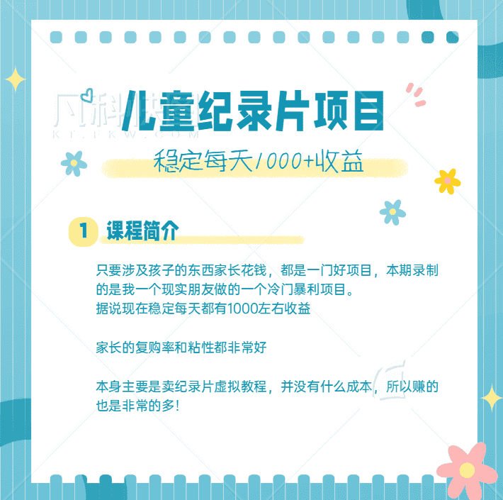 利用信息差操作冷门暴利项目,儿童纪录片合集,稳定月收入1000+【视频教程】 只要涉及孩子的东西家长花钱,都是一门好项目,今天录制的是我一个现实朋友做的一个。 据说现在稳定每天都有1000左右收益,因为她现在私域体量够大,平时维护工作也做的非常好,现在只要不定时发布一些关于孩子有用的东西 家长的复购率和粘性都非常好 本身主要是卖纪录片虚拟教程,并没有什么成本,所以赚的也是非常的多! 这次教程主要也是围绕这个项目怎么去操作和一些细节,只要按照教程的方式去做平台每天引流
