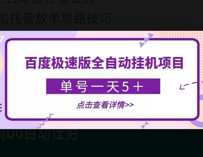 百度极速版全自动挂机,单号一天最少5+脚本全自动运行做任务附 轻松托管放单思路技巧附 广告卡包教程设备需求:安卓手机(不支持鸿蒙系统)